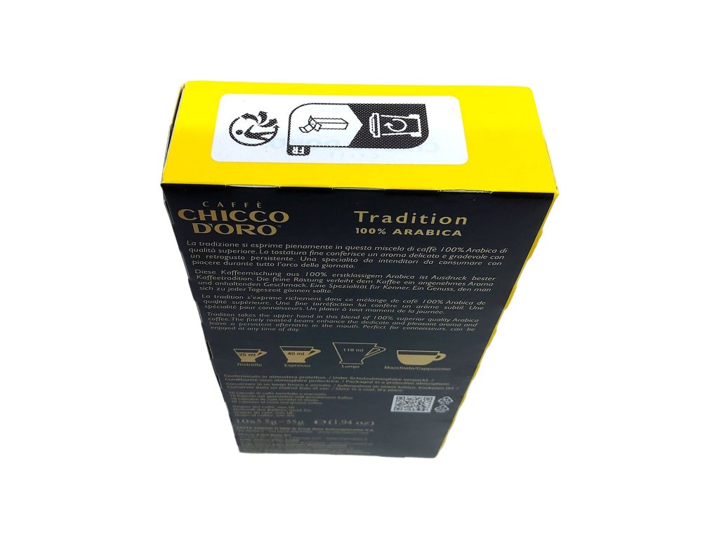 Každá kapsula je navrhnutá tak, aby zabezpečila optimálnu extrakciu a stabilnú kvalitu pri každej príprave. Sú plne kompatibilné so systémom Nespresso*, čo Vám umožní vychutnať si profesionálne pripravené espresso pohodlne doma alebo v kancelárii. Bohatá crema, plná chuť a podmanivá vôňa sa rozvinú už počas prípravy a naplnia priestor príjemnou atmosférou. Chicco d’Oro Tradition je ideálnou voľbou pre tých, ktorí obľubujú jemnejšie, no zároveň charakterovo výrazné espresso s harmonickým prejavom.