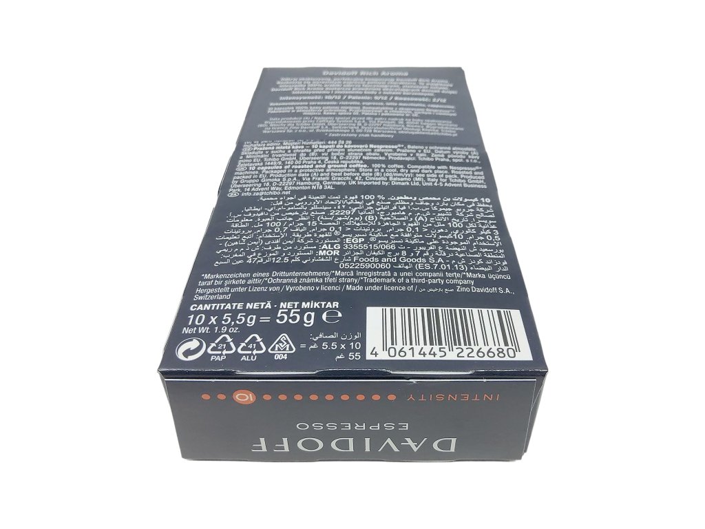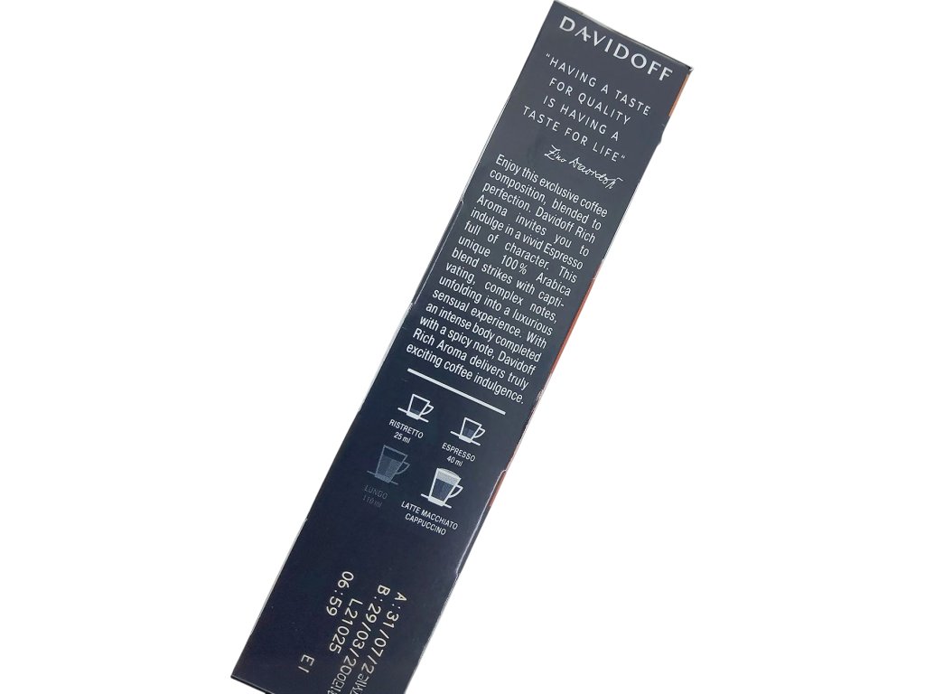 Intenzita týchto kapsúl ideálnu voľbu pre všetkých, ktorí hľadajú espresso s výrazným telom a sofistikovanou chuťou, bez toho, aby bolo príliš drsné. Každá kapsula je pre vás zárukou konzistentnej kvality a čerstvosti, pričom jej výnimočné arómy vás prenesú do sveta luxusnej kávovej kultúry. Nech už si doprajete krátku prestávku v práci, pokojný ranný rituál alebo večerné stretnutie s priateľmi, Davidoff Rich Aroma premení každý okamih na malý sviatok chutí, kde sa snúbia elegantná hĺbka, živé tóny a nezameniteľný charakter. Toto espresso nie je len nápoj – je to zážitok, ktorý pozýva objavovať, vychutnávať a zamilovať si každý dúšok.