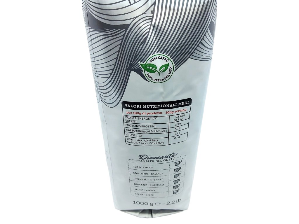 Gima Diamante sa vyznačuje nízkym obsahom kofeínu, vďaka čomu je mimoriadne jemná, príjemná a vhodná aj na častejšie vychutnávanie počas dňa. Jej chuťový profil je sladký, elegantný a harmonický, s dominantnými orieškovými a ovocnými tónmi, ktoré sa krásne rozvíjajú v každom dúšku. Jemná, ľahká crema pôsobí nenápadne, no skrýva v sebe rafinované vnútro s ušľachtilým charakterom.