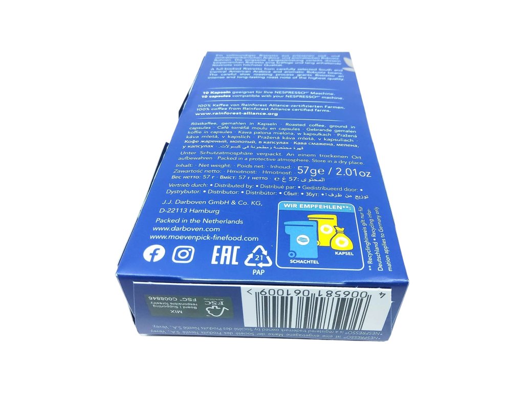 Hliníkové kapsuly dokonale chránia čerstvosť kávy, takže každá porcia chutí rovnako intenzívne ako čerstvo namletá. Stačí pár sekúnd a vznikne krátka, silná káva, ktorá dokáže povzbudiť a zároveň potešiť chuťové bunky bez zbytočnej horkosti.Mövenpick Ristretto Espresso je ideálnou voľbou pre milovníkov výrazných káv, ktorí vyhľadávajú krátku, koncentrovanú energiu a autentický kávový charakter.
