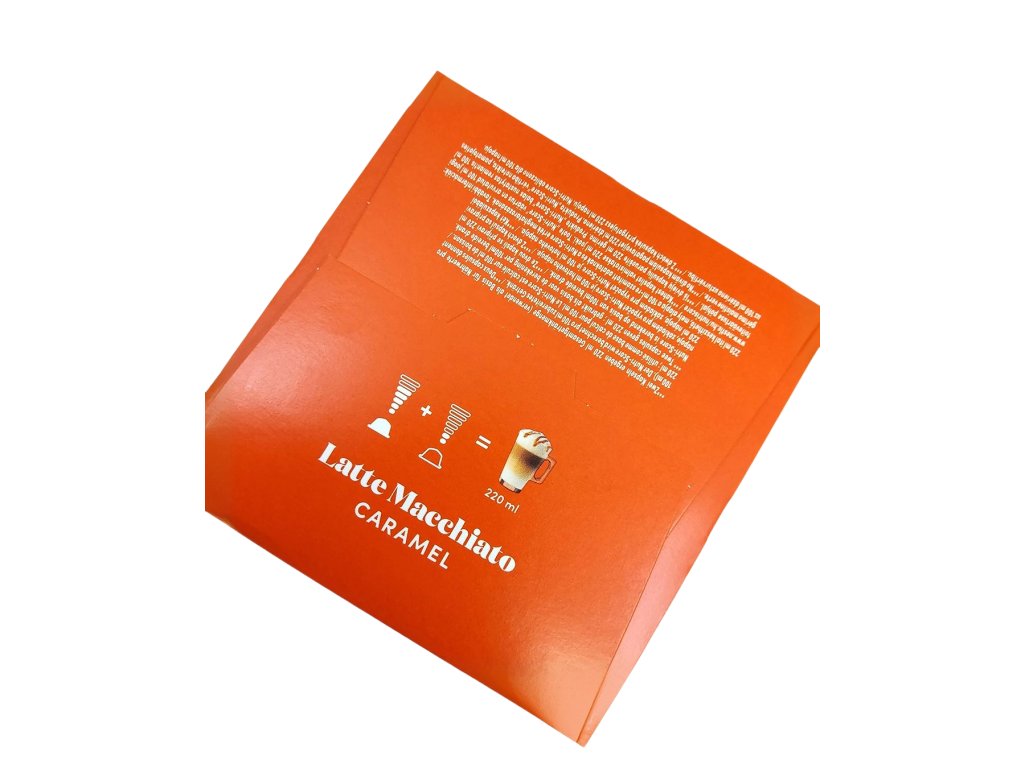 Balenie obsahuje 16 kapsúl – 8 mliečnych a 8 kávových, z ktorých si pripravíte 8 veľkých pohárov latte macchiato s typickým vrstvením. Najskôr sa pripraví horúce mlieko s jemnou penou a karamelovou arómou, následne sa pridá espresso, ktoré vytvorí charakteristickú kávovú vrstvu a dotvorí celkovú chuťovú rovnováhu. Výsledkom je harmonické spojenie jemnej kávy, krémového mlieka a sladkého karamelu.