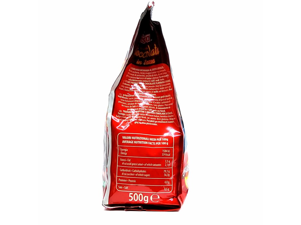 Zloženie: cukor, kakaový prášok s nízkym obsahom tuhu (20% kakao, regulátor kyslosti: uhličitany draselné), kukuričný škrob, jedlá soľ, arómy, neobsahuje lepok, môže obsahovať stopy mlieka.