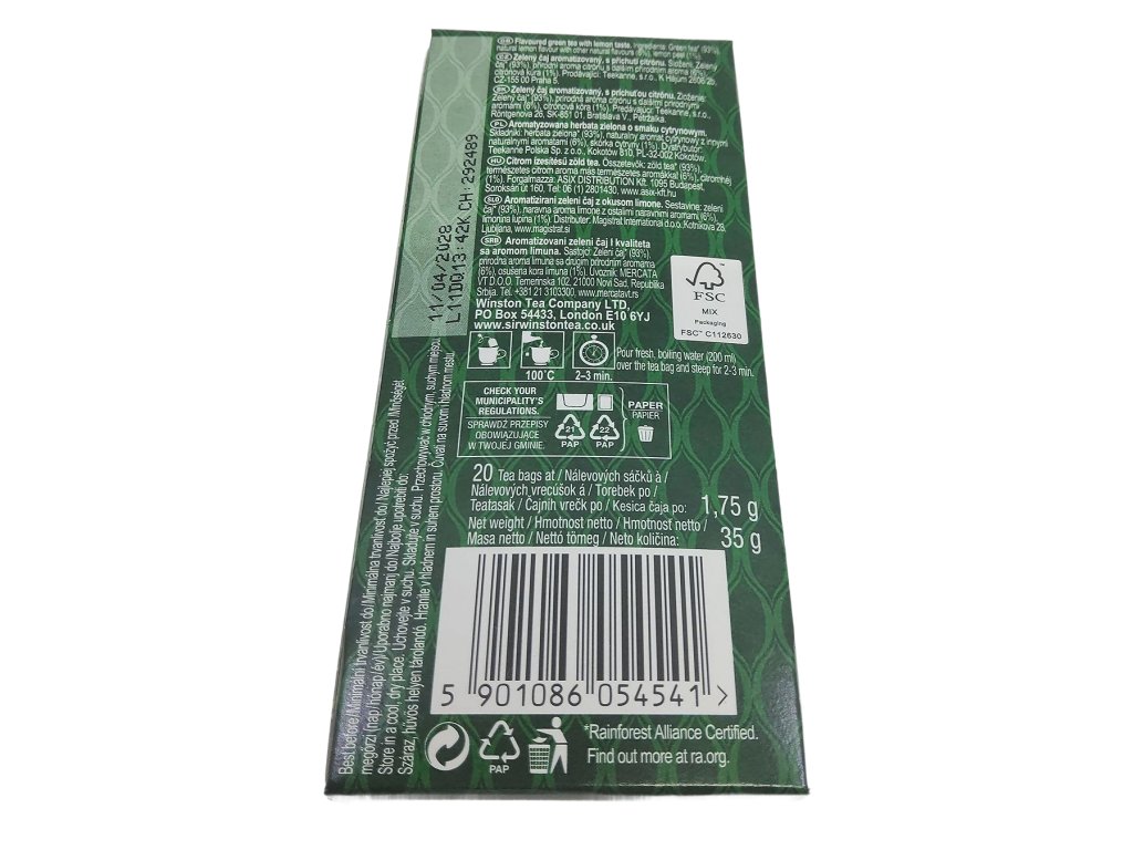 Zloženie: zelený čaj (93%), prírodná aróma citrónu s ďalšími prírodnými arómami (6%), citrónová kôra (1%)
